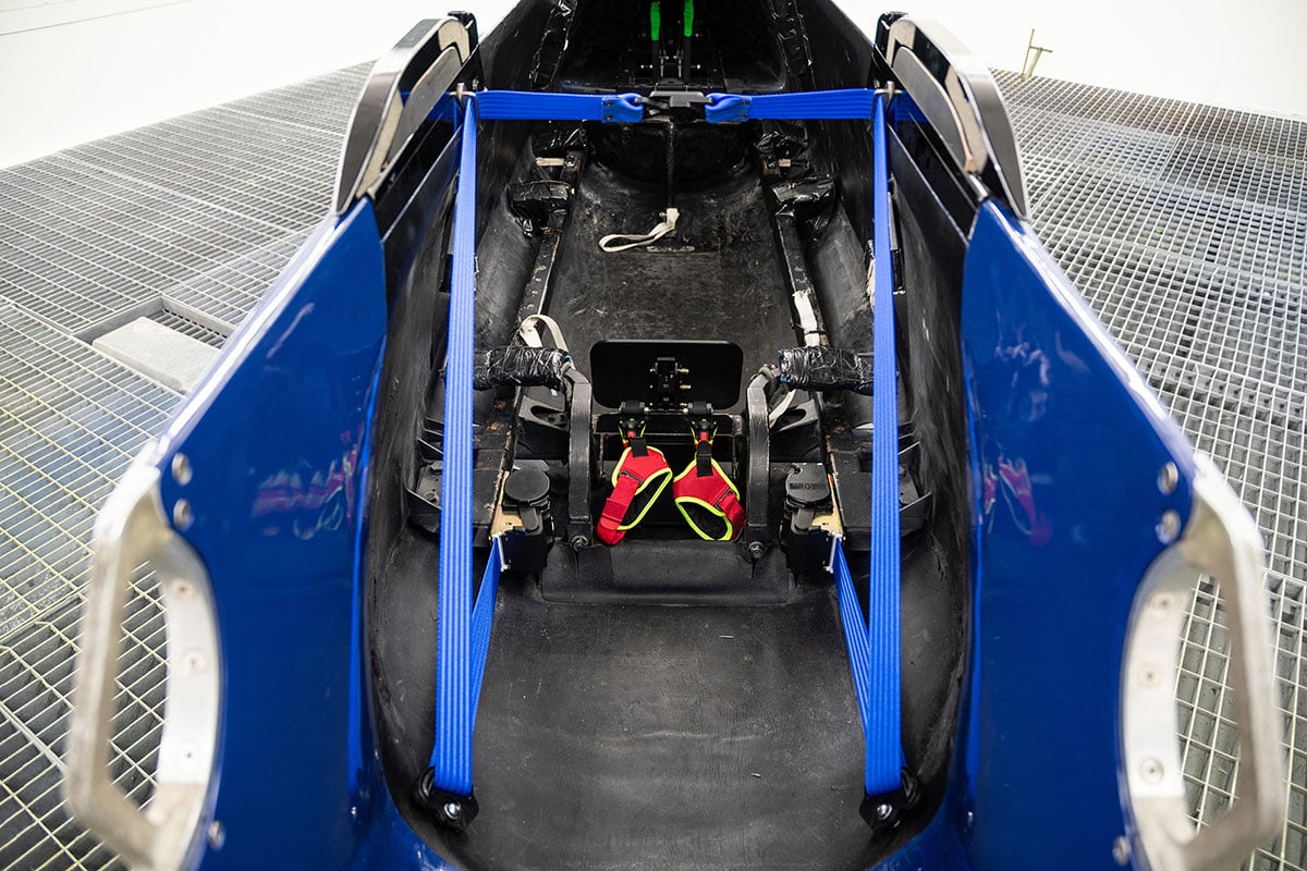 Der Pilot ist aufgrund seiner Sitzposition vor dem Herausfallen aus dem Schlitten ausreichend gesichert.